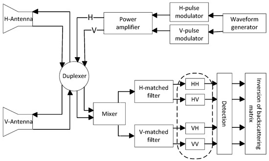 Advancements in radar technology and theory have provided a better understanding of the polarimetric information contained in radar targets [1,2,3,4]. The polarimetric features, which can be described by a second order polarimetric scattering matrix (PSM) have been widely used in various fields, such as terrain observation, disaster surveillance and atmospheric remote sensing. To accurately obtain the PSM, two fully polarimetric measurement schemes, called the alternately transmitting and simultaneously receiving (ATSR) scheme and the simultaneously transmitting and simultaneously receiving (STSR) scheme, have been widely investigated since the 1980s [5,6,7]. The ATSR radar alternately transmits waveforms through horizontal (H) and vertical (V) polarizations while both polarizations are received simultaneously on reception. At least two pulses are required in this mode to obtain the four elements for the PSM. The ATSR in essence is a time-sharing polarimetric radar, hence, the target decorrelation may influence the measurements results. In contrast, for STSR radar, the two orthogonal polarization states are transmitted and received simultaneously. Thus, the PSM of the targets can be retrieved within one pulse recurrent time (PRT). In this case, the limitation caused due to the change of the transmitted polarization states in ATSR scheme can be overcome [8].
