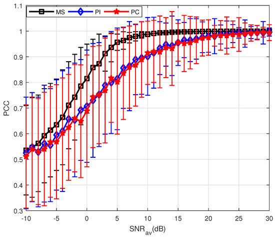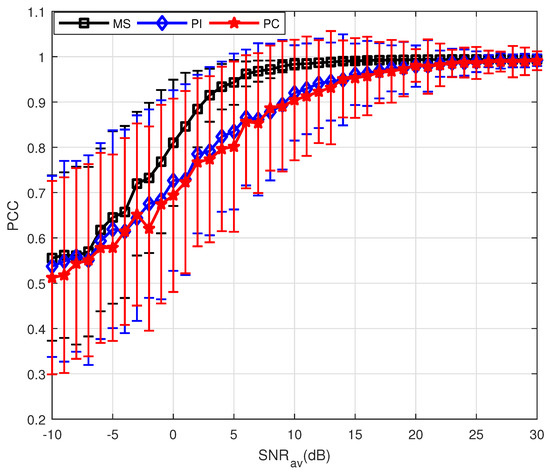 Utilizing the parameters shown in Table 1, 500 MC trials have been done at each SNR. The means and standard deviations (STD) of the are plotted as curves and error bar, respectively. Figure 2 shows the performance of these three PSM estimation methods when the target experiences uniform motion. Since the target is not static, the echoes are not incoherent. Thus, direct sum of the echoes cannot obtain effective accumulation, leading to the worst performance of the PI method. For the PC and MS method, the means increase to 1 with the increase of the , and the STD decreases owing to the same factor. As is mentioned before, the PC method uses the estimated velocity to compensate the phases of the measurements. However, it can be observed from Equation (22) that the accuracy of the velocity estimation is influenced by the SNR, and random errors in the estimation are inevitable. With a potentially inaccurate estimation, the phase generated by the target motion cannot be compensated completely, leading to the degradation in the PC results. By using partial measurements selected, the MS method gets the best performance. The essential reason is that by measurements selection, the echoes with similar phase are chosen, which means the selection coefficient . The phases of these selected measurements are approximatively coherent, leading to the best performance of the MS method.