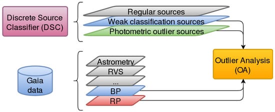 - Apsis is devoted to the classification of all the observed sources [11,12,13] by means of several work packages enclosed within this CU, the Discrete Source Classifier (DSC) [13] being the main one. It processes the whole Gaia dataset in order to classify the sources into a known astronomical type (star, quasar, galaxy, etc.) by means of Support Vector Machines (SVM) [14], tagging as outliers those sources that do not appropriately fit these models. The rest of the modules are aimed at more specific classification tasks for subgroups of sources that satisfy certain requirements.This article is associated with one of these packages, Outlier Analysis (OA, Figure 2), which is devoted to the analysis, using unsupervised Artificial Intelligence methods on spectrophotometric data (BP/RP spectra), of those sources tagged by the DSC module [13] as outlier sources because either they cannot be fitted into any of the models used by DSC so they are considered photometric outliers, or they cannot be classified with enough probability, i.e., weakly classified sources.These outlier sources are expected to be of the order of 10% of the whole Gaia dataset, i.e., approximately sources (100 Terabytes), which will be processed by the OA module in order to throw some light on their nature, pretending to provide not only plain astronomical object types (stars, ultra-cool dwarfs, white dwarfs, planetary nebulae, quasars, and galaxies), but also sub-types [11].
