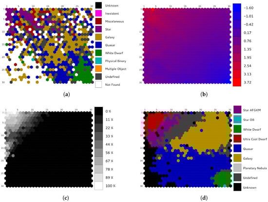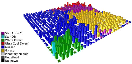 - Category distribution (Figure 8c) represents a particular type of astronomical object (i.e., stars, white dwarfs, quasars, etc.), displaying how such sources are distributed among the neurons.
