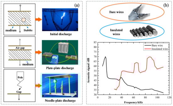 (a) The common types of partial discharges (PD); (b) bare wire and insulated wire and the discharge spectrum of bare wire and insulated wire in the air.