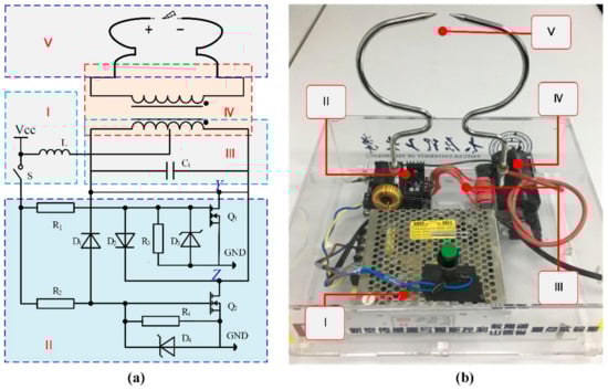 PD simulator device: (a) circuit diagram and (b) physical diagram in the laboratory. Part I: power supply module; part II: DC–AC conversion circuit; part III: LC oscillation circuit; part IV: high voltage coil; part V: needle-needle electrode.