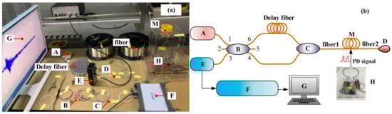 Optical fiber PD detection system (OFPDS). (a) Experimental device diagram and (b) the experimental schematic diagram. A—Laser, B—3 × 3 Coupler, C—2 × 1 Coupler, D—1 × 2 Coupler, E—Detector, F—Data acquisition (DAQ) card, G—Personal computer (PC), H—PD simulator device, M—optical fiber sensor.