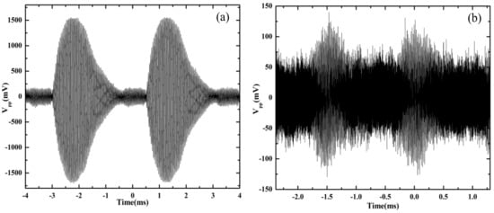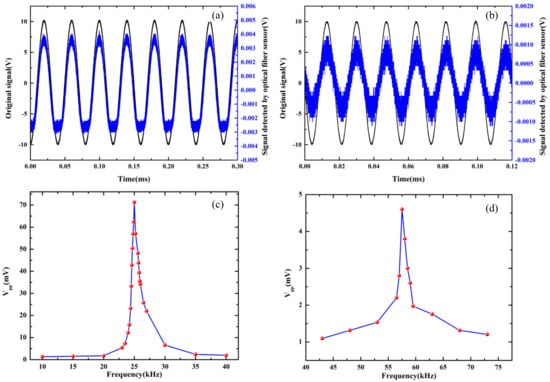The sinusoidal ultrasonic signal was detected by the optical fiber sensing probe, and then the signals were detected by the OFPDS, as shown in Figure 5. The distance between the optical fiber sensing probe and the ultrasonic transducer was 4 cm, the Vpp of the sinusoidal signal in black from the generator was 20 V, but the sinusoidal ultrasonic signal detected by the optical fiber sensing probe in blue was different. At the same distance, the Vpp of the sinusoidal ultrasonic signal detected by the optical fiber sensing probe in blue was 8 mV, the central frequency of the ultrasonic transducer was 25 kHz, as shown in Figure 5a. The Vpp was 2 mV with a central frequency of the ultrasonic transducer of 58 kHz, as shown in Figure 5b. The domain signal detected by the OFPDS in blue was consistent with the original signal in black.
