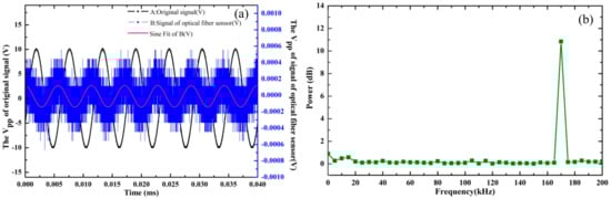 The Vpp of the signal generator was set to 20 V and the frequency of the signal generator was set to 175 kHz. Then the signal generator generated a sinusoidal signal in black, which was applied to the ultrasonic transducer to send out a standard ultrasonic signal of 175 kHz. The ultrasonic signal was detected by the optical fiber sensing probe; the signal was not able to be detected when the ultrasonic transducer was 0 cm or further from the fiber sensor. In this case, we wound the fiber around the metal shell of the ultrasonic transducer, with a fiber lap number of 10. The signals in blue detected by the OFPDS in the time-domain are shown in Figure 8a. The Vpp of the sine fit of the ultrasonic signals detected by the optical fiber sensing probe in red was 0.2 mV. As the detected signal was weak, the frequency spectrum of the ultrasonic signals was verified using OFPDS. The peak at 175 kHz showed good consistency with the central frequency of the 175 kHz ultrasonic transducer, as shown in Figure 8b.