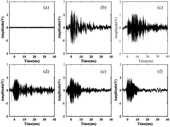Time-domain waveform of PD signals at different positions. (a) No partial discharge event. The sensing probe is placed (b) on the top, (c) in the front, (d) behind, (e) on the left side and (f) on the right side of the discharge protection hood.