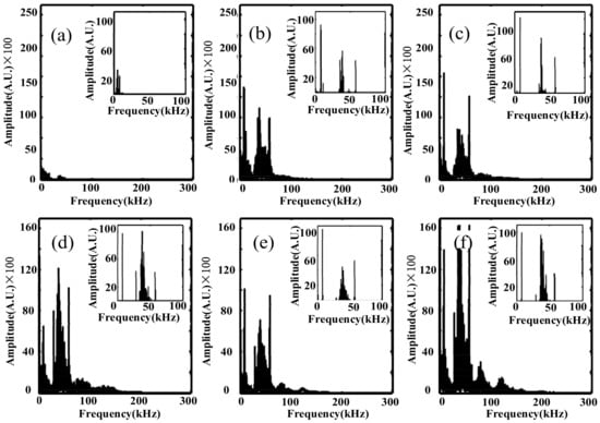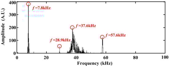 In addition, we investigated the influence of the optical fiber sensing probe on ultrasonic signals of PD from the frequency domain waveform. Figure 12 shows that there were obvious characteristic frequency components at 7.8 kHz, 28.9 kHz, 37.6 kHz and 57.6 kHz. Therefore, these frequency components were analyzed statistically, and the results are shown in the following Figure 15.
