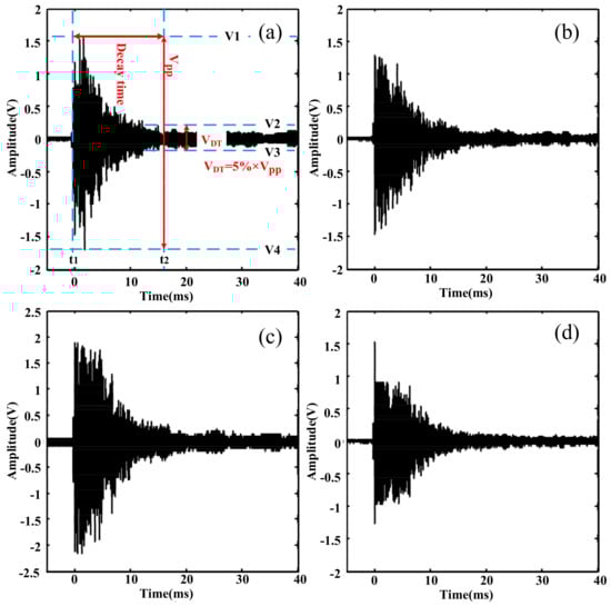 Figure 14 shows the variation of Vpp and decay time with the number of sensing fiber circles. Figure 14a shows that the overall trend of Vpp was nonlinear and fluctuant within 100 laps; this means that the number of sensing fiber circles was not the only influencing factor for the sensing performance in the time-domain. The large fluctuations with some laps reflect that other factors such as fiber looseness may have played a role. Figure 14b shows that as the number of sensing fiber circles increased, the decay time was strongly influenced by the lap number, with a trend of fluctuant growth. There was always an exponential decay and oscillation in the detected excitation ultrasonic signal. With the increase in the number of sensing fiber circles, the sensing system could detect more decay components, because the affecting time upon the phase shift in the optical fiber caused by the propagating ultrasonic signal also increased.