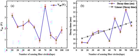 The variations of (a) Vpp and (b) decay time versus the number of sensing fiber circles.
