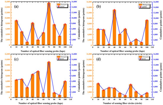 Figure 15 shows that the cumulative histogram and the cumulative points of the frequency intensity of the detected ultrasonic signals varied with the number of sensing fiber circles. With a certain lap number, the cumulative histogram and points had the maximum value, for example, 70 laps for 7.8 kHz (as shown in Figure 15a) and 37.6 kHz (as shown in Figure 15c), 40 laps for 28.9 kHz (as shown in Figure 15b), and 10 laps for 57.6 kHz (as shown in Figure 15d). In addition, the overall frequency response of 57.6 kHz was smaller than other frequency components. From the above analysis, we can see that there was an obvious frequency selectivity in the PD ultrasonic signal, even if the sensing probe was changed with the number of sensing fiber circles. This means that these characteristic frequency components could be used for the detection evaluation of the PD ultrasonic signal.