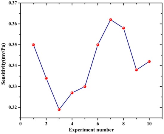 Figure 16 shows the sensitivity of the optical fiber PD sensing system. A total of 10 groups of repetitive experiments were carried out, in which the distance between the sound pressure meter and the ultrasonic transducer was 1 cm, the excitation ultrasonic signal was 25 kHz with 20 V. The detected Vpp by the optical fiber sensing probe was about 7 mV and the average sound pressure level was 120.23 dB. Thus, the sensitivity of this system was able to be obtained according to the following equation:
