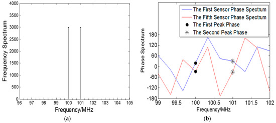 Mixed incoherent sources signal spectrums: (a) The first sensor frequency spectrum; (b) The first sensor and fifth sensors phase spectrum.