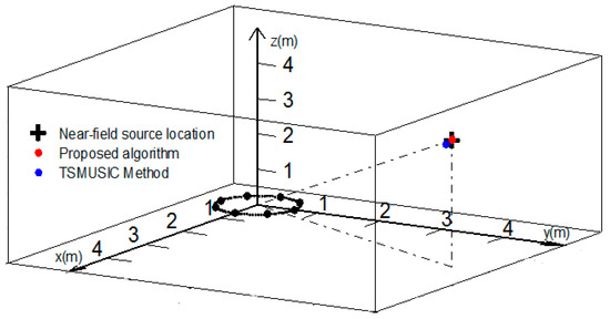 As shown in Figure 6, the + shape represents the real location of the near-field source, the red dot represents the location of the near-field source by employing the proposed method, and the blue dot represent the location of the near-field source by employing TSMUSIC method. It is can be noticed that the proposed algorithm and the TSMUSIC method can achieve the localization of the near-field source. Moreover, the positioning result of the proposed algorithm is more precise than that of the TSMUSIC method.