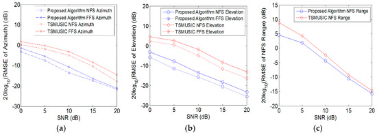 RMSEs versus SNR: (a) Azimuth angle; (b) Elevation angle; (c) Near-field source range.