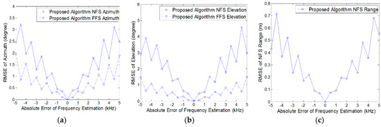 RMSEs versus absolute error of frequency estimation (SNR = 20 dB): (a) Azimuth angle; (b) Elevation angle; (c) Near-field source range.