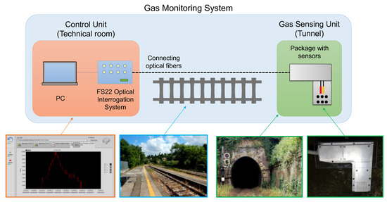 The gas monitoring system herein proposed is based on the architecture depicted in Figure 1, where two main components can be distinguished: the sensing unit (SU) and the control unit (CU). The SU is located in the railway tunnel and is composed of an aluminum package, hosting the following fiber sensors: (i) a LPG-based gas sensor and (ii) a FBG-based temperature and humidity sensor. The SU is connected to the CU, located in the technical room of the railway station, by two 500 m long single mode fibers. The CU comprises two main hardware systems, the HBM FS22 optical interrogator and a personal computer, respectively. The interrogator is controlled through a custom LabView software, which manages all the controls and operations, starting from the acquisition of sensors spectra up to the real-time estimation of gas concentration.