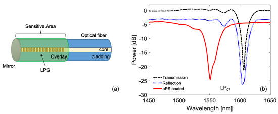 The core of the SU consists of the single-ended LPG, coated with a thin layer of aPS as a sensitive overlay, as schematically depicted in Figure 2a. The design and characterization of such a sensor has been presented and discussed in our previous paper [31]. Briefly, we focused the attention on LPG technology, since it has been employed in several physical, chemical, and biological applications [32,33,34,35,36,37,38]. It consists of a periodic perturbation, with period of hundreds of μm, in the refractive index and/or the geometry of the optical fiber [39,40,41].