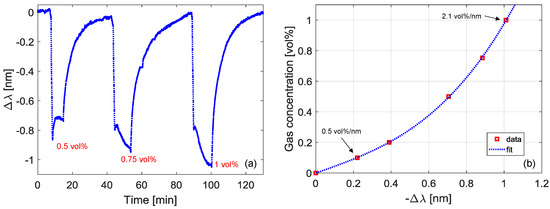 The sensor response towards butane was characterized by using a custom-designed test chamber. The set-up is constituted by two lines: the first one for the butane and the second one for an inert gas (nitrogen), and the gas flow is tuned using mass flow controllers. The complete schematic of the experimental setup for gas testing can be found in [31]. The sensor was thus exposed to different concentrations of butane, in the range 0.1–1.0 vol %. As an example, we report in Figure 3a the variation in the spectral position of the LP07 band when the LPG was exposed to butane concentrations of 0.5, 0.75, and 1.0 vol %. The sensor practically exhibits an immediate reaction to gas presence, and the following response times were measured: rising T90~2–5 min and falling T10~15 min. The curve in Figure 3b reports the gas concentration as a function of the negative wavelength shift within the range 0–1.0 vol %. As one can observe, the data fitting can be obtained with a 3rd degree polynomial. Around the concentration of 0.1 vol %, the slope is 0.5 vol %/nm, while it increases to 2.1 vol %/nm around 1.0 vol % of butane. Finally, it should be highlighted that butane LEL is equal to 1.8 vol %, and thus we focused the attention on concentrations lower than about half the LEL.