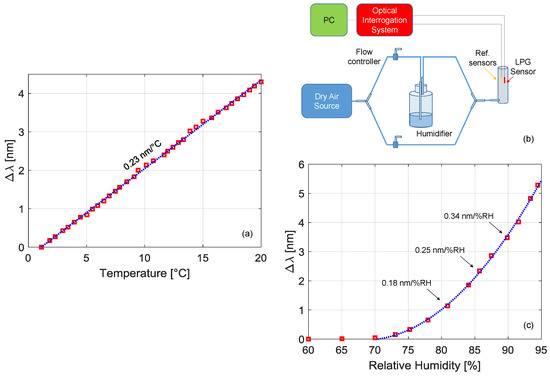 (a) Wavelength shift of the LPG sensor versus temperature; (b) schematic setup for humidity characterization; (c) wavelength shift of the LPG sensor versus humidity.