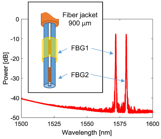 In particular, we designed a single-ended array composed of two 0.5 cm long FBGs (spaced 1.0 cm), namely FBG1 and FBG2, written in SMF28 fiber, and schematically reported in Figure 5. The first one is coated with a polyimide (PI) layer with thickness around 20 μm and resonance wavelength λB1 = 1572.067 nm. The second one is bare and characterized by λB2 = 1579.95 nm. The resonance wavelengths of the array were designed in order to avoid spectral overlapping even during the sensing phase; in addition, they can be potentially used in multiplexing with the LPG gas sensor. The spectrum of the array is reported in Figure 5 as well. Finally, both FBGs were characterized, resulting in the following sensitivities to temperature—ST1 = ST2 = 10.1 pm/°C—and humidity—SRH1 = 2.8 pm/%RH (FBG2 shows no humidity dependency).