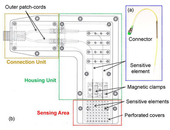 Figure 6b reports the CAD image of the designed package. It is mainly composed of three independent regions: (i) the “sensing area”, containing the sensitive area of the fiber devices; (ii) the “housing unit”, where the two optical fibers are positioned and kept fixed by means of properly designed magnetic clamps; and (iii) the “connection unit”, needed to connect the optical fibers containing the sensors with the outer patch-cords travelling throughout the tunnel and reaching the technical room where the interrogation system is located.