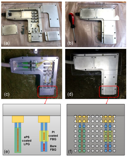 Some photos of the realized package are reported in Figure 7a,b. The package was installed on the inner wall of the railway tunnel, at 30 cm from the floor in a maintenance cavity located at 50 m far from the entrance (Figure 7c,d). Such a position was chosen considering that, in case of a leakage, liquefied petroleum gas occupies creeks and deposits on the floor, due to its higher density compared to air. Figure 7e,f show a schematic representation of the “sensing area” (~4 cm2), with the two single-ended fibers hosting the LPG-based gas sensor and the 2-FBGs array for temperature and humidity, respectively. The sensor package is connected with two approx. 500 m long single mode fiber patch-cords reaching the technical room with the interrogation unit. Finally, to avoid water infiltration inside the package, a Plexiglas canopy was also realized and mounted on the aluminum package.