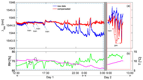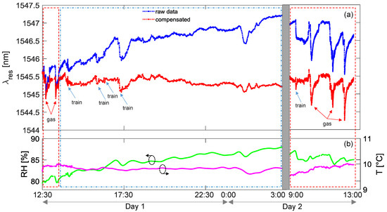 We focus now on the time interval from 13:00 h of Day 1 to the following morning of Day 2 in Figure 8, when no leakage test could be performed due to train transits. In this period, the behavior of the (raw) resonance wavelength exhibits a slow monotonic increase of about 2.0 nm, with the presence of faster changes, principally due to the transit of trains (indicated by blue arrows in figure). The former effect is directly related to environmental changes and in particular to the relative humidity increasing from 81% to 88%, while the temperature variations were lower than 2 °C. This effect is quasi-completely compensated in the red curve reported in the same figure. Concerning the second effect, the train transits induce faster changes in the humidity sensor response and faster changes in temperature curve. However, from compensated data, it can be noted that in some cases the response of the sensor to trains is almost trivial, whereas in other cases it is more pronounced and not always completely compensated. We believe that this could be attributed to the exhaust gas from diesel-powered trains and thus could disappear in the case of electric trains. Additionally, another event resulting in a fast change of the raw resonant wavelength as well as the humidity curve is measured after midnight, which is not related to a train transit and is well compensated in the red curve.