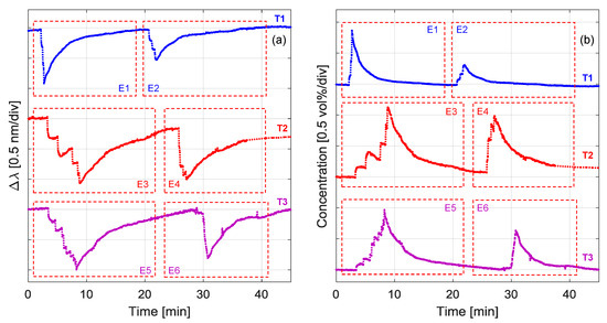 In Figure 10b, we have reported the corresponding butane concentrations, as calculated from the responses of Figure 10a and the characterization presented in Figure 3b. It appears clear that within the range 0–10 min (i.e., considering E1, E3 and E5), the concentration associated to the single exposition step is always reduced from T1 to T3, whereas the total concentration of the sequence is kept constant at ~1 vol %. Above this range (>10 min), the sensor signal returns to zero, allowing a second sequence of testing (i.e., E2, E4, and E6) characterized by a slightly lower accumulated concentration. As an overall consideration, it can be reported that during the different performed tests, a negative wavelength shift from 0.1 to 1.1 nm was revealed by the developed sensor, validating its reliability in detecting gas up to the maximum used concentration of 1 vol %.