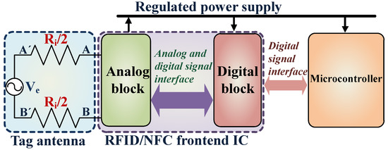 The basic system architecture of a passive tag, including the frontend IC and a microcontroller is presented here. The tag antenna is exemplified by the voltage source and the series resistance .