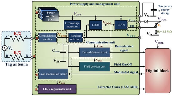 The tag only uses the induced energy available from the RF (Radio Frequency) field of the reader device. Several RF-powering circuits have been proposed in [32,50,51,52,53]. The basic architecture of the power supply and management unit is similar to the designs presented in [50,52]. The power supply and management unit comprise of the over-voltage protection circuit along with the power rectifier, demodulation rectifier (partially), bandgap reference and low-dropout regulators (LDO1 and LDO2). LDO1 provides a fixed supply voltage of = which supplies the demodulation unit, field detector unit and the clock regenerator unit. The digital block of the IC and the external components are powered by LDO2 with the voltage = to .