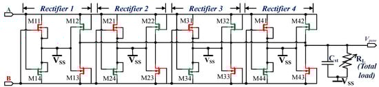 In this design, four parallel gate cross-connected NMOS rectifier units are used as shown in Figure 5. Where represents the total load supported by the rectifier and capacitor is used for temporary storage. The transistors Mn1 and Mn4 function as switches whereas Mn2 and Mn3 are the diode-connected devices, where n = 1 to 4. The phase-inverted antenna inputs A and B switch on each of the even and odd numbered transistor pairs in respective clock cycles. Each of the switches is turned on by the complete swing of the voltage at respective clock cycles. For example voltage at the input A creates a conducting path between input A, even numbered diode-connected devices (Mn2 and Mn4) and the load . The devices Mn2 and Mn4 are turned on, which means input B has the same potential as VSS. At this point, Mn1 and Mn3 are switched off. In the next clock cycle, the same process is repeated where the odd-numbered diode connected devices are switched on and the even numbered are switched off. The cross-coupled NMOS rectifier is discussed in detail in the works [50,52], hence any further explanation is avoided here.
