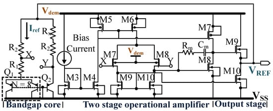 A two-stage op-amp operating in the sub-threshold region is used as an error amplifier to track the node voltages at X and Y (refer Figure 6). The output buffer stage is implemented using a source-follower configuration. The simulated loop gain of the op-amp is and has a GBW (gain-bandwidth) of . The simulated PSR (power supply rejection) is approximately at and at . For improving the loop stability, a Miller compensation is provided in the form of = 100 K and = 2.06 pF, as shown in Figure 6. The inclusion of the miller compensation degrades the PSR of the circuit at the higher frequency to an extent which can be compensated by including a small decoupling capacitor of at the output of the reference circuit. The higher gain of the op-amp helps to increase the PSR at the lower frequency.