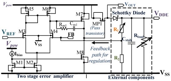 Figure 7 shows LDO2 along with the external components which provide a voltage for all the external components such as the microcontroller, sensors and the digital core of the IC. The LDO2 presented here, consists of a two-stage error amplifier and a PMOS (MP1) as the pass transistor. The output voltage is set by , and . The external Schottky diode prevents discharging of the capacitor through the pass transistor. The Schottky diode is not needed if the pass transistor is implemented using an NMOS. But this will increase the overall dropout voltage by . If the dropout voltage for the LDO2 is , and that of the Schottky diode is , the expression for and can be given as: