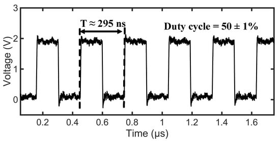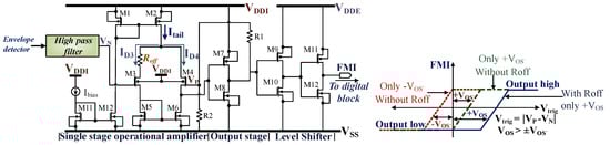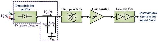 The demodulator is designed to demodulate minimum of 10 % ASK modulated signal sent by the reader to the tag. Typically, the modulation amplitude ranges within to for this design, which depends on the field strength, coupling factor and the distance between the reader and the tag. Several methods can be used to demodulate 10% ASK signal which is discussed in [33,34,35]. In [33,34], the demodulator circuit consists of two unity gain buffers, a high gain amplifier, and a hysteresis comparator. The work [3] uses an adaptive threshold voltage for the comparator to demodulate the 10% ASK signal. Most of the cited work uses a comparator and some additional circuitries for the demodulation. Thus, the comparator has a stable reference for comparison.