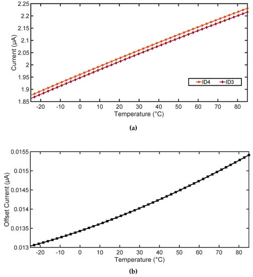 For a constant W/L and , is exponentially dependent on , having much smaller value in comparison to the drain current in saturation or strong inversion region. The sub-threshold operation of a transistor is illustrated in [46,47,48,49].