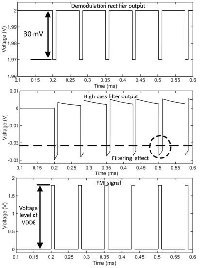 Figure 9 shows the closed loop comparator used for this design along with the high-pass filter, input nodes and , and the output signal FMI (Field Modulation In). The high-pass filter has a cutoff frequency of , which strips the modulation signal from the envelope signal obtained from the demodulation rectifier. The input offset voltage of the comparator influences the trigger point for the transition of the comparator output from high to low and vice versa. can be defined as: