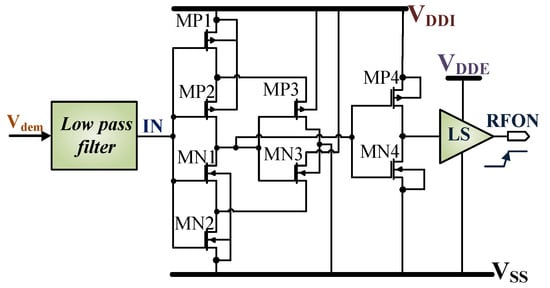 Since the turn of the millennia, many state-of-the-art RFID or NFC protocol tag ICs were introduced. In this perspective, one of the earliest contributions was illustrated in [31]. The CMOS transceiver [31], compatible with the standard ISO 14443, was realized in a CMOS technology with an area of an area of and a power consumption of . With the scaling down of the CMOS technology, over the years, the overall power consumption and the IC area have been reduced drastically. For example, the frontend IC presented in [32] used FSK (frequency shift keying) demodulation, had a power consumption of and an area of . A few years later, a passive tag IC compatible with the ISO-14443 type-B standard was presented in [33], which had an IC area of and a total power consumption of . More recently, the NFC tag IC proposed in [3] had a moderate analog power consumption of and an IC die area of . The demodulation of 10% ASK modulated signal is always challenging in the presence of noise or jitter either from the environment or the from the internal circuits of the IC [3,33]. Different methods can be used to demodulate 10% ASK signal which is discussed in [33,34,35]. Most of the demodulator circuit consists of complex circuitries like unity gain buffers, high gain amplifiers, and comparators. An adaptive threshold voltage for the comparator to demodulate the 10% ASK signal, had been proposed in [3].