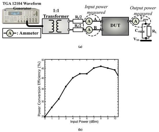 (a) A simplified view of the setup used for the measurement of the power conversion efficiency where DUT (device under test) is the frontend IC; (b) Measured power conversion efficiency of the power rectifier for an of .