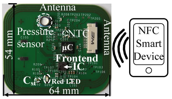 Figure 20 shows the passive tag developed consisting of a µC (microcontroller) ATMEGA 164PA, a pressure sensor MS5803-30BA and a negative temperature coefficient (NTC) sensor. The tag antenna has an inductance of and a ceramic capacitor of is used for the temporary energy storage required for passive operation. For an NFC reader like Nexus 7 the effective read-range is to depending on the orientation. The measured read-range achieved for an ISO15693 RFID reader ( ± ) is . At the modulation amplitude of the signal measured at the tag antenna sent by the reader is . In general, as the distance between the reader and tag increases the induced voltage at the tag antenna decreases. In reader to tag communication mode, with the increment in the distance, the modulation signal depth at the antenna input decreases. The demodulation circuit is able to detect a minimum modulation depth of , as ascertained from the measured FMI signal. Although the communication didn’t work beyond . Because in the tag to reader communication mode, as the distance between the reader and the tag increases, the modulation depth produced by the modulator circuit increases as the voltage input at the tag antenna decreases. This increment in the modulation depth affects the duty cycle of the clock signal produced by the clock regenerator circuit, which thereby results in distortion of the timing constraints required for a proper communication sequence. The passive tag can operate with a minimum field strength of which is measured endowing with the standard [70] using a reference antenna and an , probe.