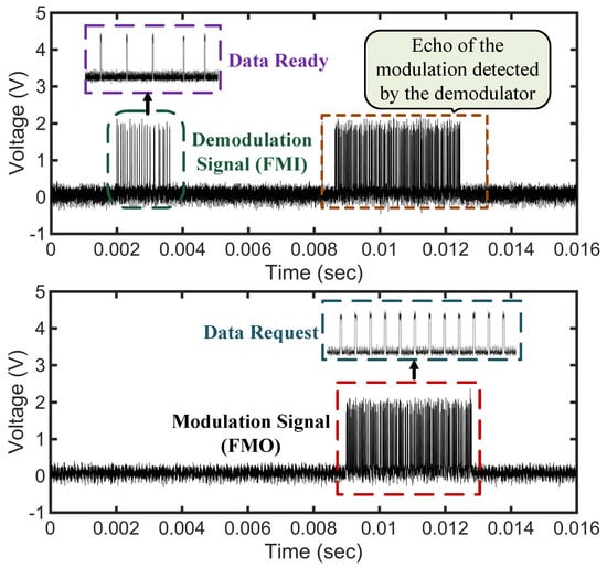 Figure 21 depicts the entire communication process in between the reader and the tag. The communication signal sent to the reader is retrieved by the demodulator circuit denoted as FMI signal. The Data Ready signal indicates the 5 bytes of the command to get the UID (unique identification) of the tag. For a successful reception of a request, the microcontroller prepares the particular response and transmits it back to the reader using the FMO signal. The demodulator circuit detects the modulation signal as exhibited in Figure 21, but the digital logic of the IC ignores it as it is in the transmit mode. The Data Request signal shows the response prepared by the tag which is the 12 bytes of the tag UID. Figure 22 shows the FC4 clock extracted by the clock regenerator having a frequency of and a duty cycle of . Android-based application software is developed to readout the sensor data from the passive tag. Figure 23 shows the measurement process involving the passive tag and the smart device. In Table 3, the measured key parameters of the design are listed.