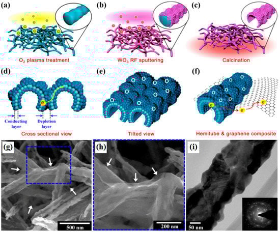 Template-assisted methods have been widely used in fabricating 3D architectures, due to the advantages of the diverse morphology of the available templates and large-scale synthesis [56]. Choi et al. reported 3D WO3 hemitubes functionalized by graphene with high surface area made using a nonwoven polymeric fiber composed of polyvinylpyrollidone (PVP)/poly(methyl methacrylate) (PMMA) composite as template under O2 plasma treatment conditions [57]. A schematic illustration of the graphene/WO3 3D structure formation process is shown in Figure 1a–f. Firstly, WO3 hemitube structures with wrinkled, bumpy surface topology were achieved by RF-sputtering WO3 films onto the O2 treated PVP/PMMA composite nanofiber templates, followed by high temperature calcination to remove the polymeric template; Finally, graphene was homogenously mixed with WO3 hemitubes to form 3D nanocomposites owing to the heterojunction between WO3 hemitubes and graphene induced by the charge transportation [57]. The morphology of 3D graphene/WO3 hemitubes is showed in Figure 1g–i.