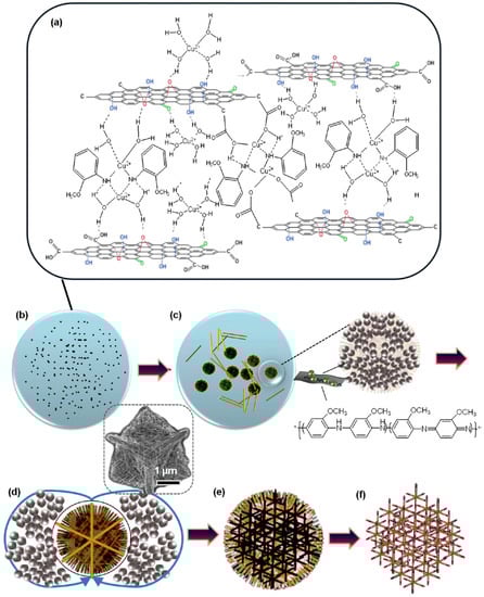(a–f) Schematic illustration of the Cu2O crystallization process assisted by o-anisidine and GO. Reproduced with permission from [60], © 2012 American Chemical Society.