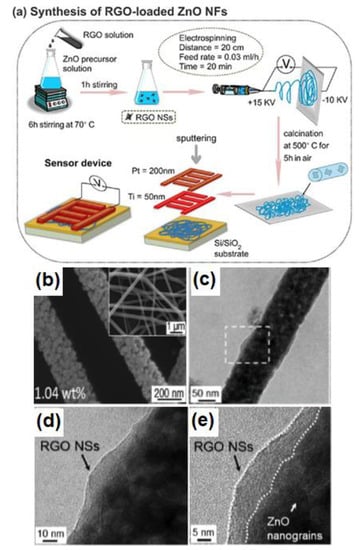 (a) Schematic illustration of formation of rGO nanosheet-loaded ZnO core-shell nanofibers; (b–e) SEM and TEM pictures of samples. Reproduced with permission from [61], © 2015 Elsevier.
