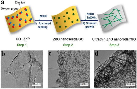 (a) Schematic illustration of fabrication of rGO/UT-ZNR; (b–d) TEM images of GO, GO/ZnO nanoseeds and rGO/UT-ZNR. Reproduced with permission from [65], © 2016 American Chemical Society.