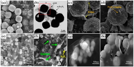 Morphology of (a–b) rGO/α-Fe2O3 cubic nanostructure [74]; (c,d) rGO decorated TiO2 microspheres [78]; (e) N-rGO/NiO cube [75]; (f) rGO/In2O3 cube nanocomposites [76]; (g,h) graphene-wrapped WO3 nanospheres [79]. (a–d) and (g,h) were reproduced with permission from [74,78,79], © Elsevier. (e,f) were reproduced with permission from [75,76] © American Chemical Society.