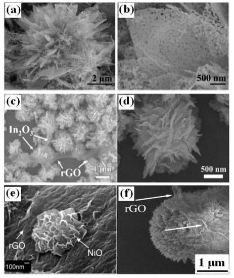 Morphology of (a,b) 3D hierarchical porous ZnO nanoflowers modified with rGO [83]; (c,d) 3D rGO-In2O3 composite [84]; (e) rGO/NiO nanoflowers [85]; (f) urchinlike CuO 3D structures modified by rGO [86]. (a–e) were reproduced with permission from [83,84,85], © Elsevier. (f) were reproduced with permission from [86] © 2014 American Chemical Society.