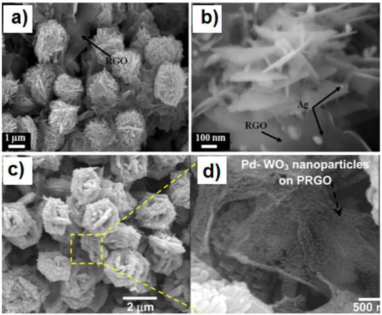 Single elements such as noble metals can be used to decorate the as-prepared rGO-MOx 3D architectures to form a ternary composite. Uddin et al. synthesized an Ag-loaded 3D ZnO nanostructure-rGO (Ag/ZnO Hrc-RGO) hybrid using a facile hydrothermal method followed by an efficient photochemical route for the Ag deposition [93]. The pH level adjusted by the capping agent molecules (NH4OH) and the anisotropic growth of ZnO play very important roles in the formation of hierarchical ZnO microsphere-like nanosheet assemblies. Figure 8a, b show that small-sized Ag nanoparticles with an average particle size of 40 nm are attached onto the ZnO nanosheets, closely affixed onto the 3 to 5-layer thick RGO sheets [93]. Using a controlled hydrothermal process, Esfandiar et al. prepared 3D rGO-WO3-Pd ternary composites in which Pd/WO3 nanostructures were incorporated on partially reduced graphene oxide (PRGO) sheets [94]. The nanostructure growth of WO3 on the graphene sheet could be improved by the addition of the PRGO during the hydrothermal process and the final ternary hybrids exhibited a hierarchical nanostructure with a high surface area (Figure 8c, d) [94].