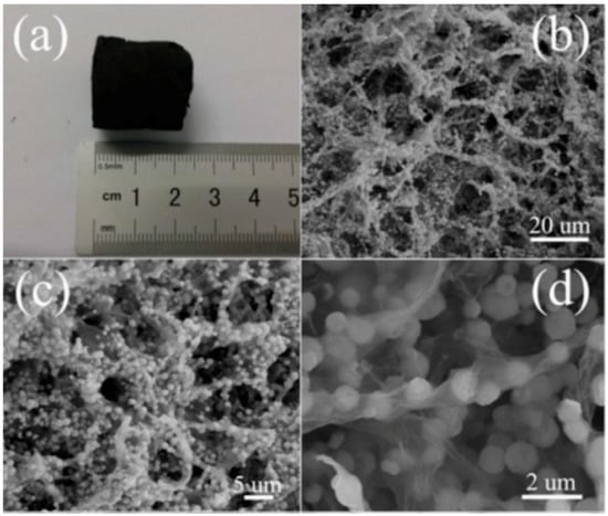 Morphology of 3D rGO aerogel/ZnO spheres composite. (a) A photograph of composite. (b–d) SEM images with different magnifications of rGO aerogel/ZnO spheres composite. Reproduced with permission from [43], © 2015 Elsevier.