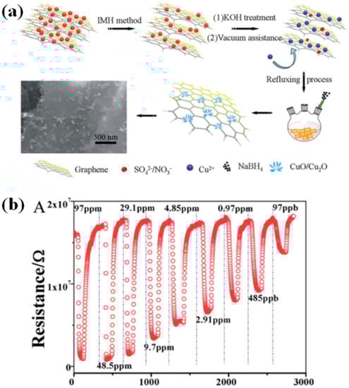 Controllable preparation of MOx with confined sizes in the nanohybrids could be one efficient way to contribute to enhancing sensing properties. Yang et al. developed a 3D nanoflower-like CuxO consisting of 5–9 nm ultrafine nanoparticles/multilayer graphene (CuMGC) composites as a room temperature NO2 gas sensor [92]. The 3D nanoflower-like CuxO was located in-situ on the multilayer rGO via three steps (Figure 10a). The 3D hybrids showed a high sensitivity (95.1) and fast response time (9.6 s) to 97 ppm of NO2 (Figure 10b). The enhanced sensitivity is attributed to the small size 3D CuxO flowers with high surface area which could provide more active sites for the surface adsorption reaction of NO2, while the fast response is due to the Schottky contact between rGO and small size CuxO leading to formation of many more donors to capture and migrate electrons from the conduction band. Using a similar route, Mao et al. prepared a 3D rGO-based NO2 sensor with enhanced sensitivity (287% to 100 ppm of NO2) and selectivity by decoration of ultrafine (3–6 nm) SnO2 nanocrystals [108].