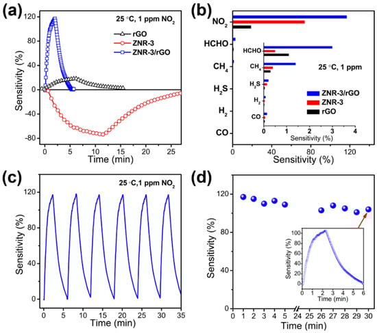 We recently developed a novel high-performance room-temperature NO2 sensor based on 3D rGO/ultrathin ZnO nanorods (rGO/UT-ZNR) with simultaneous characteristics of size-confined ZnO nanorods (with average diameter of 12 nm) and mesoporous structure [65]. The rGO/UT-ZNR-based NO2 sensor exhibited high sensitivity (119% to 1 ppm NO2), low LOD of 50 ppb and fast response and recovery (75 and 132 s to 1 ppm NO2). Meanwhile, the rGO/UT-ZNR sensor presented a favorable linearity, good selectivity and stability (Figure 11a–d). The 3D rGO/UT-ZNR nanohybrids with high surface area and mesopore structures improved the of NO2 diffusion/adsorption within the nanohybrid film, resulting in a higher sensitivity and faster sensing dynamics than rGO- or UT-ZNR- based sensors at room temperature [65]. On the other hand, the selective adsorption and strong adsorption capacity between ZnO and NO2 induced the outstanding selectivity of the rGO/UT-ZNR nanohybrids.